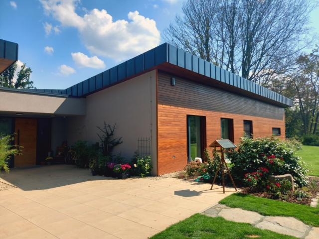 Podieľali sme sa na stavbe tejto vskutku nádhernej a rozsiahlej dvojgeneračnej jednopodlažnej vily, ktorá je zasadená priamo do parku českej obce Senohraby. Išlo o kombinovanú monolitickú drevostavbu a veľkoplošné presklenie stien, takže nosná dodávka pozostávala z expanzných a okenných pások a lepidiel, primerov a polyuretánových lepidiel na hliníkové konštrukcie.