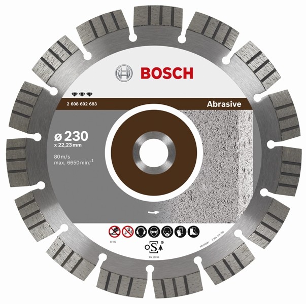 Diamantový rezný kotúč na čerstvý-nevyzretý betón, maltu, omietku, pálené tehly, pemzu, pieskovec, pórobetón, poterový betón, sadrokartón, škridlicu, tehlu, vápnosádru a iné stavebné materiály. Výška segmentu 12mm.