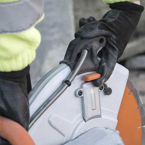 - Nastaviteľný chránič kotúča viete ovládať jednou rukou zatiaľ čo druhou rukou držíte pílu, čo umožňuje rýchle a bezpečné nastavenie keďže držíte ruku mimo ostria