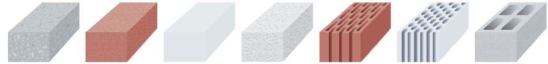 - Pórobetón , Plná tehla , Dierovaná tehla , Betónová tvárnica , Betón a kameň