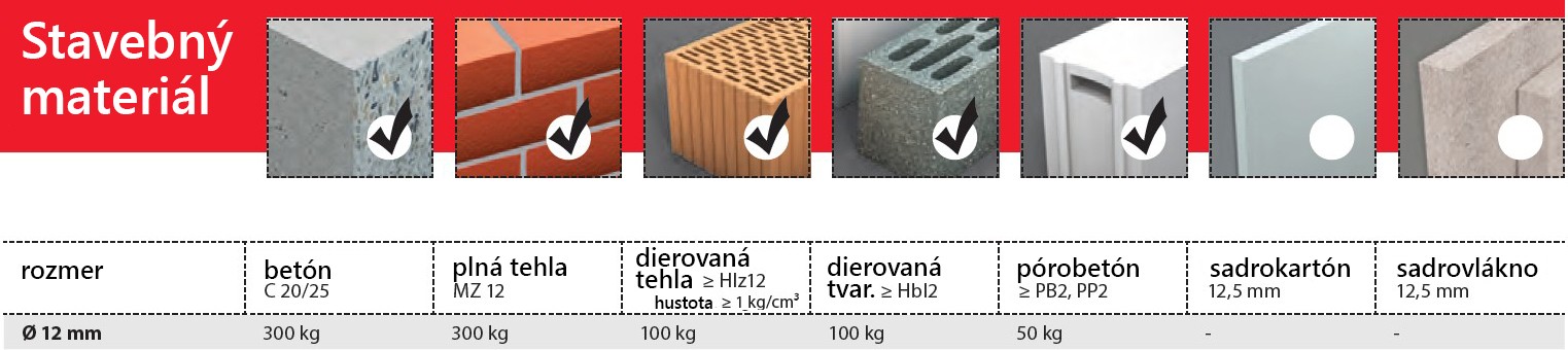 - únosnosť v pórobetóne je 60 kg, v plných materiáloch 300kg a v dutinových materiáloch 100 kg