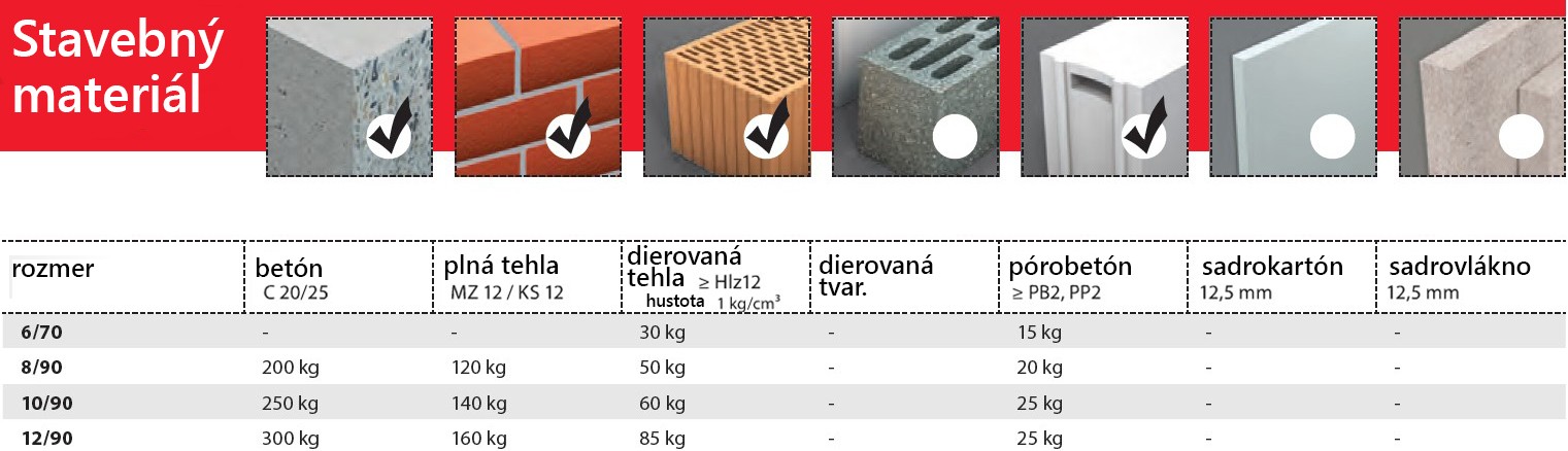 - dierovaná tehla, plná tehla, betón, pórobetón