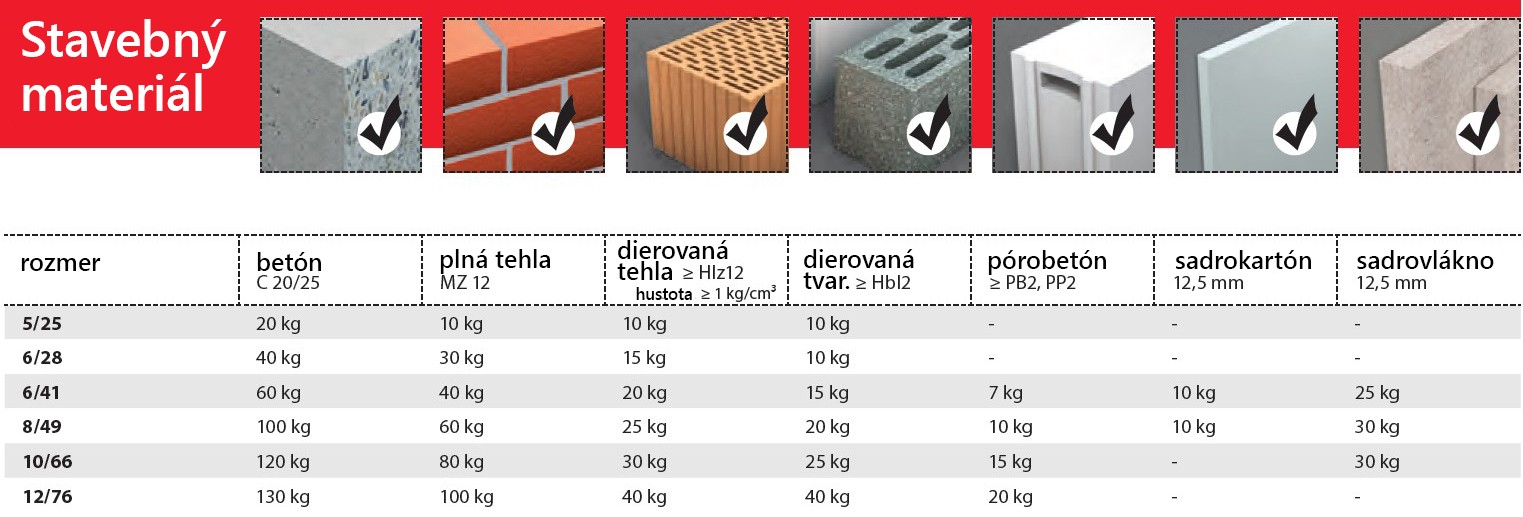 - sadrokartón, betón, kameň, plná tehla, dutá tehla
