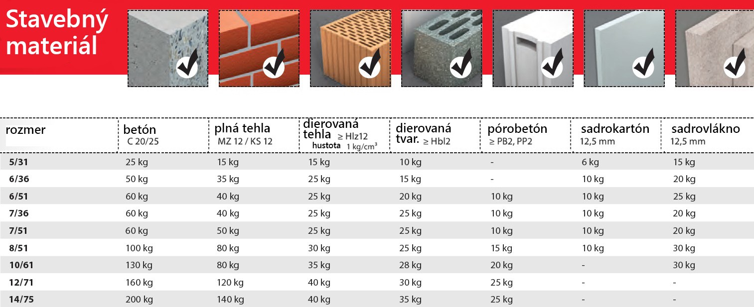 - betón, kameň, dierovaná tehla, plná tehla, sadrokartón, porobetón