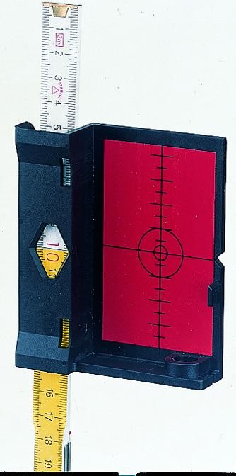 - Terčová platňa s magnetickým držiakom a priečnymi vlasmi na vyrovnanie lasera vertikálne a horizontálne s cieľovým bodom