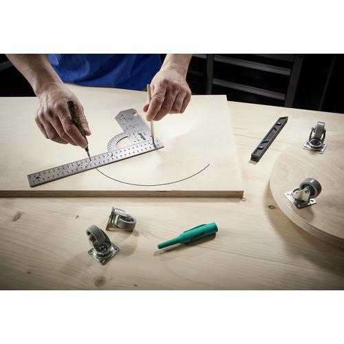 Oceľová univerzálna meracia pomôcka a značkovacia šablóna spája širokú škálu funkcií v jedinom nástroji. Univerzálny uhlový a skúšobný štvorec vám umožňuje ľahko určiť a preniesť vzdialenosti a uhlové merania. Byť vedený robustným dorazom a čiarou otvoru znamená, že môžete bez námahy kresliť paralelné čiary ceruzkou. Doraz na uhlovej koľajnici môžete rýchlo demontovať, aby ste mohli presne označiť alebo zmerať povrchy. Na prenášanie kriviek a kružníc na obrobky jednoducho použijete univerzálny uholník ako kompas. Dva pevné polomery na stupnici merania uhla umožňujú rýchly prenos kriviek, napr. pre zaoblené rohy dosiek. Uhol pôsobí ako stabilná nábežná hrana pri použití priamočiarej píly. Rýchlo sa stane nepostrádateľným pri pokladaní laminátu alebo výrobe nábytku. Či už potrebujete integrovaný 45° doraz, 32-dierovú líniu alebo vŕtaciu šablónu pre skryté pánty, s univerzálnym uhlovým a skúšobným štvorhranom budete dobre vybavení na to, aby ste sa pustili do akéhokoľvek projektu.