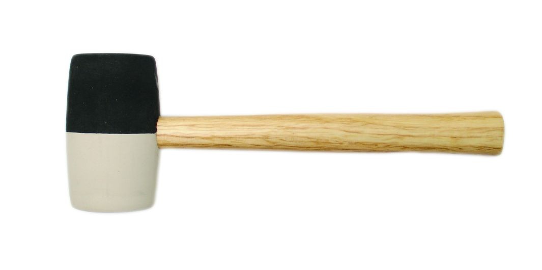 Gumené čiernobiele kladivo s ergonomickou drevenou násadou vo veľkosti 65mm.
