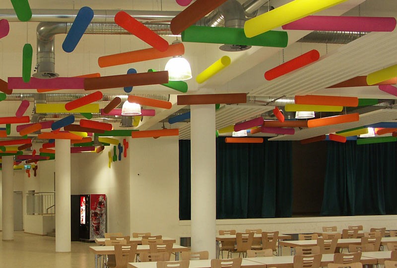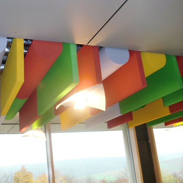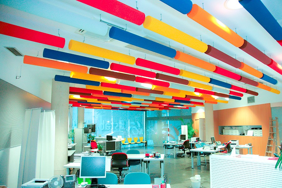 Akustické stropné teleso v tvare valca z melamínovej živice na akustický útlm v interiéri